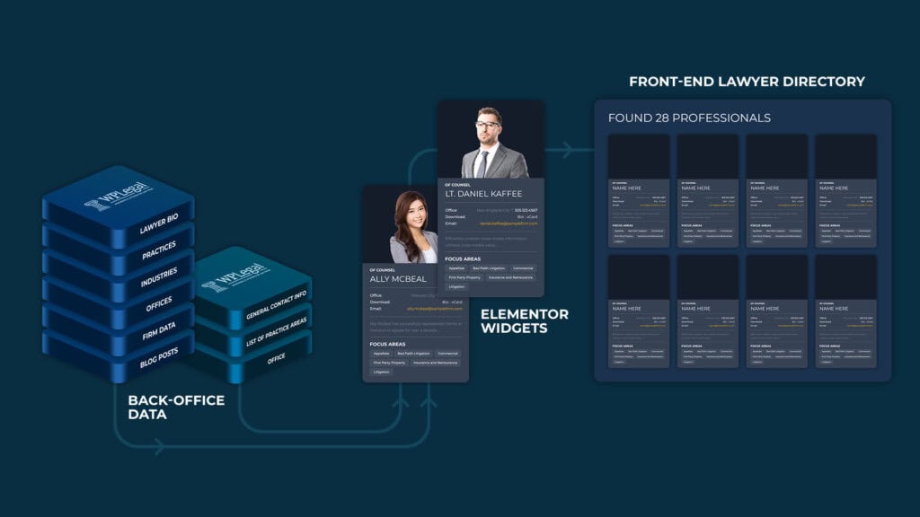 Lawyer Directories, Bio pages with vCards, Practice Area grids, Office pages with Google Maps and more. All automatically-populated from your latest Back Office content & data.